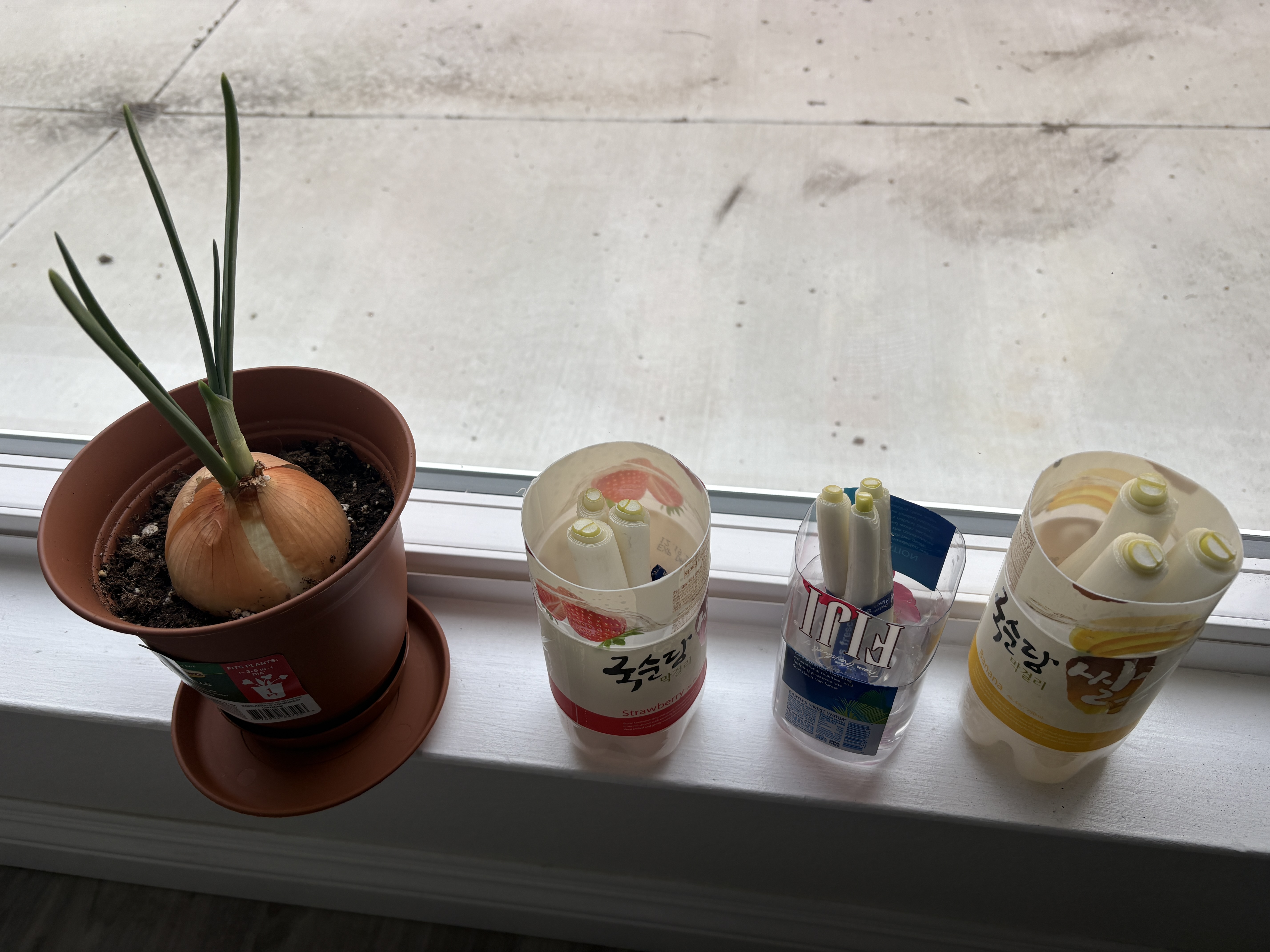양파의 친구들이 생겼다. 한인 마트에서 구매해온 대파를 썰다가 뿌리가 보였다. 혹시나 해서 검색해 보니 물에만 담가두어도 잘 자란다기에, 근처에 보이는 페트병을 잘라 대파들을 심어주었다. 그래도 양파가 '첫째'니까 화분을 차지하는 건 좀 이해해 주겠지...?